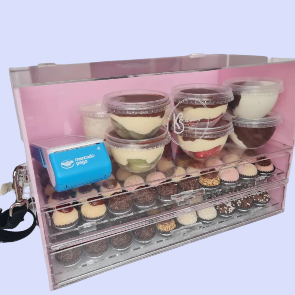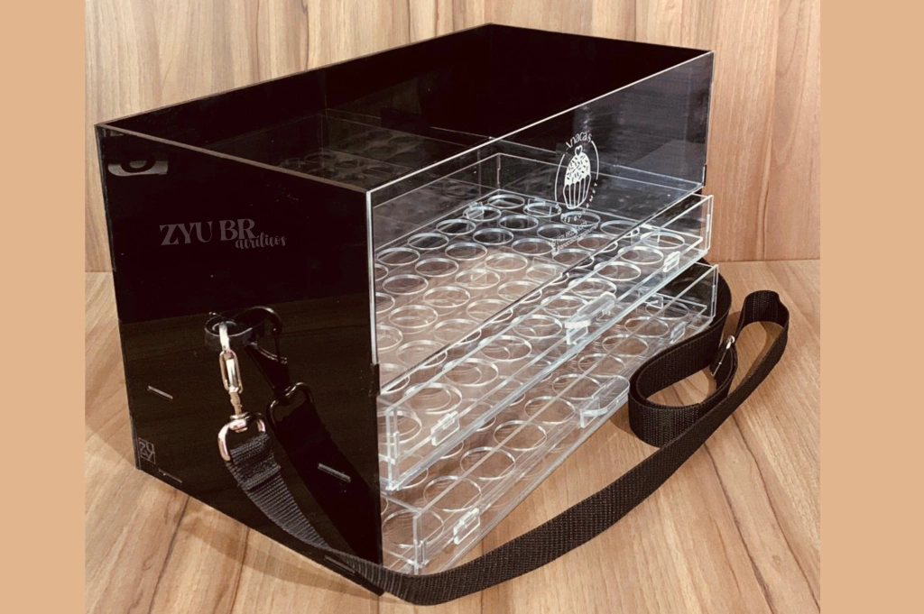 Caixa / Expositor para Doces / Brigadeiros em Acrílico - Bolo no Pote + Gaveta + Alça – Forminhas nº4 (Ideais para brigadeiros de 20 a 25g aproximadamente)