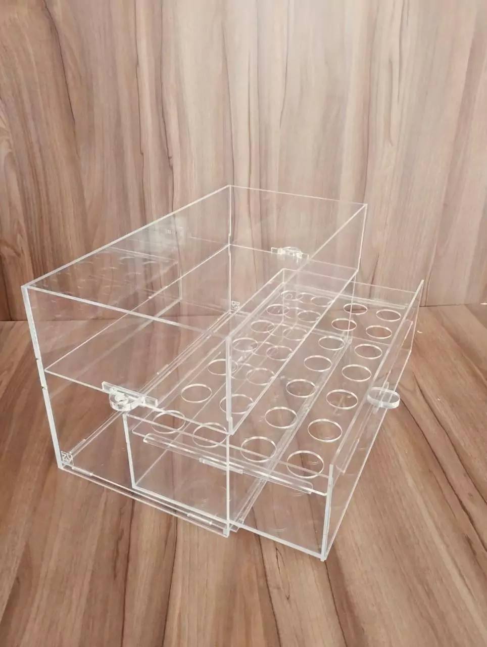 Caixa / Expositor para Doces / Brigadeiros em Acrílico - Parte superior com Tampa + Gaveta com Divisória para 28 cones + Alça – Forminhas nº4 (Ideais para brigadeiros de 20 a 25g aproximadamente)