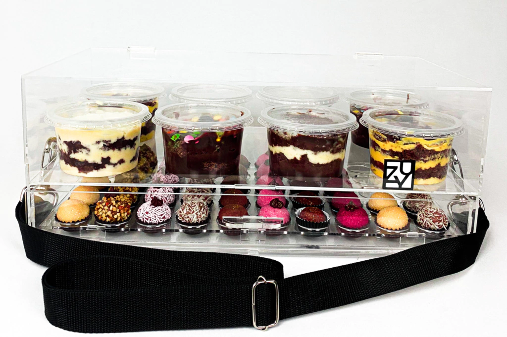 Caixa / Expositor para Doces / Brigadeiros em Acrílico - Bolo no Pote + Gaveta + Alça – Forminhas nº4 (Ideais para brigadeiros de 20 a 25g aproximadamente)