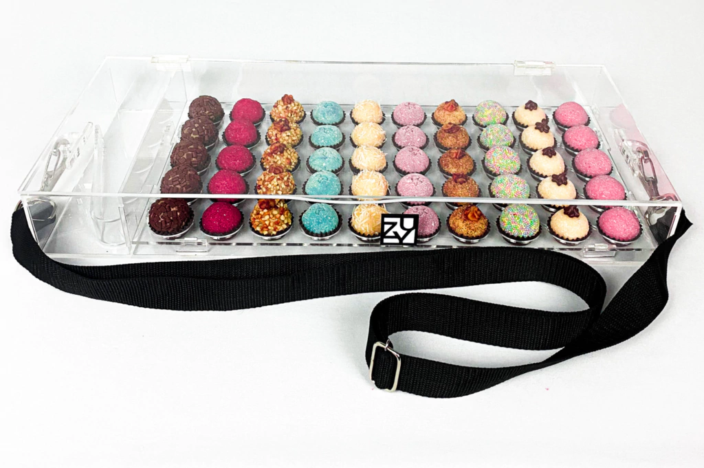 Caixa / Expositor para Doces / Brigadeiros em Acrílico - 50 Unidades + Espaço para pegador + Alça – Forminhas nº5 (Ideais para brigadeiros de 15 a 20g aproximadamente)